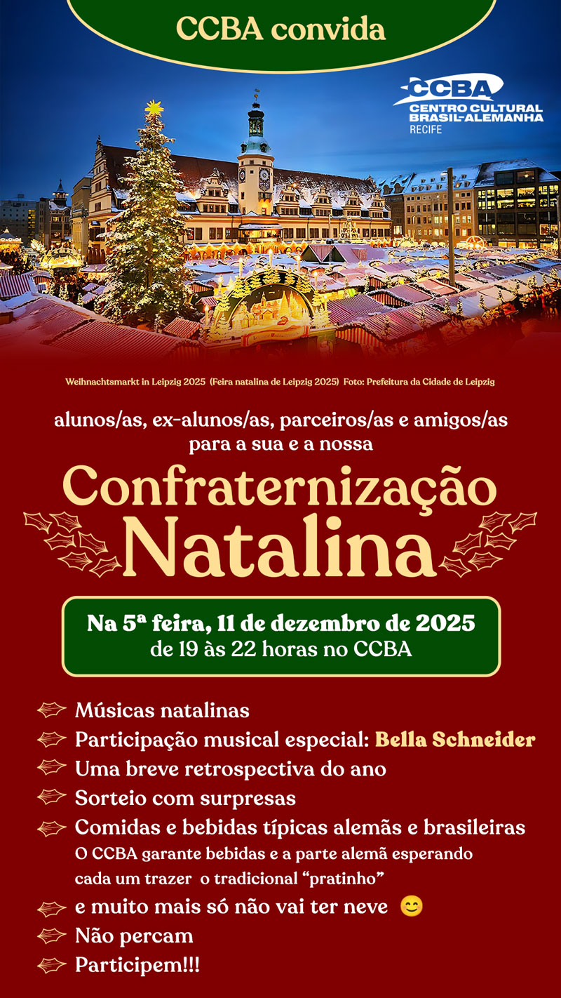 CCBA convida alunos/as, ex-alunos/as, parceiros/as e amigos/as para a sua e a nossa Confraternização Natalina 2025 quer será na 5ª feira, 11 de dezembro de 2025 de 19 as 22 horas no CCBA.